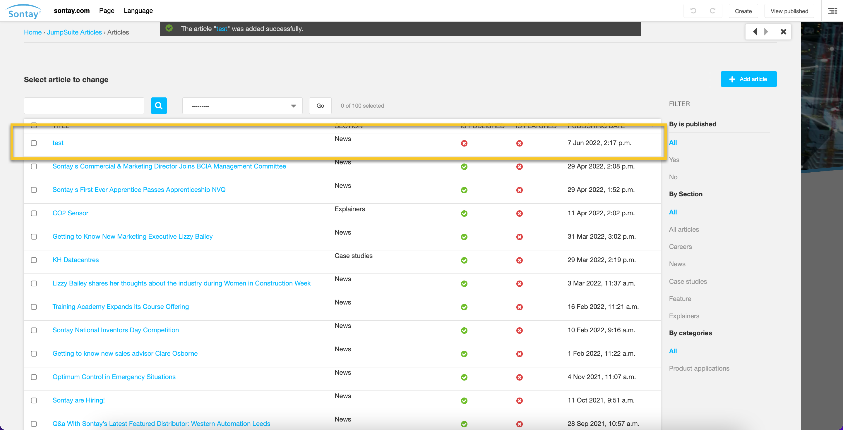 Step 7: Press ‘save’ and the article will appear in the article listing