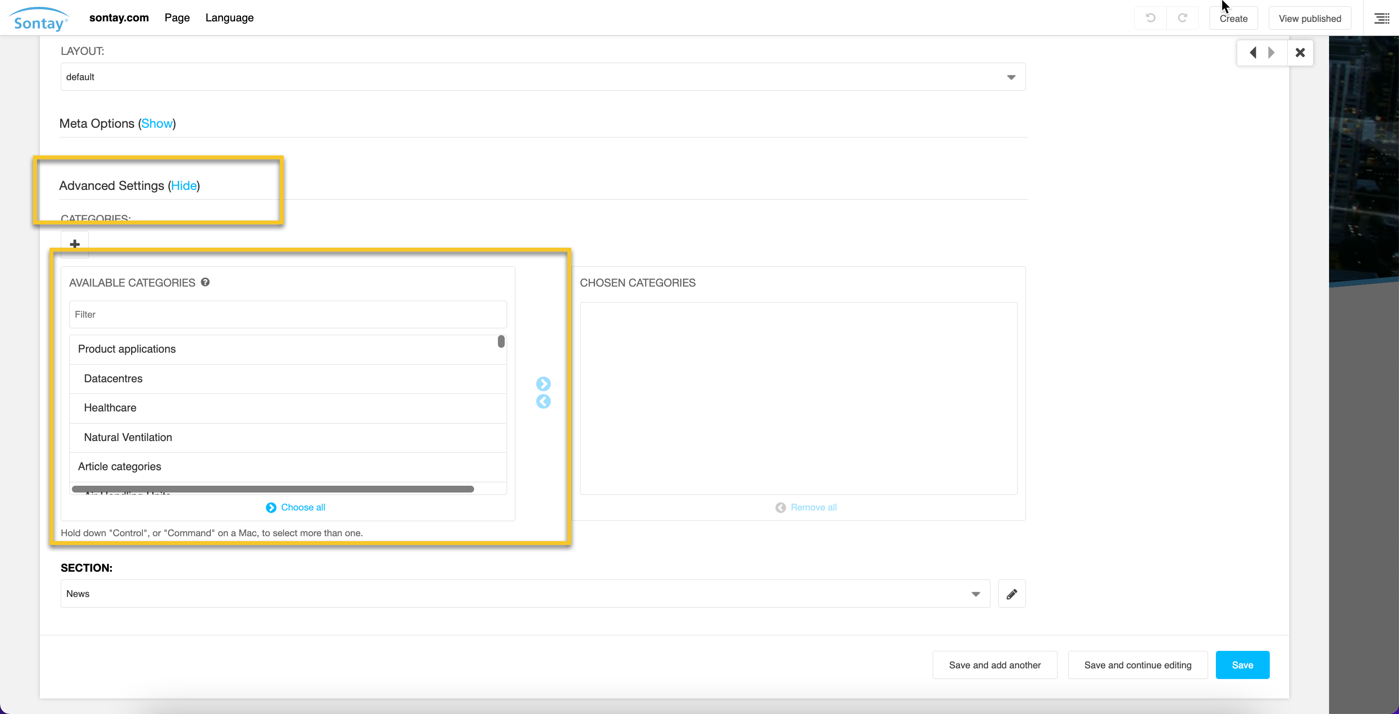 Scroll down to the ‘advanced settings’ tab to select the categories that the article will appear under.