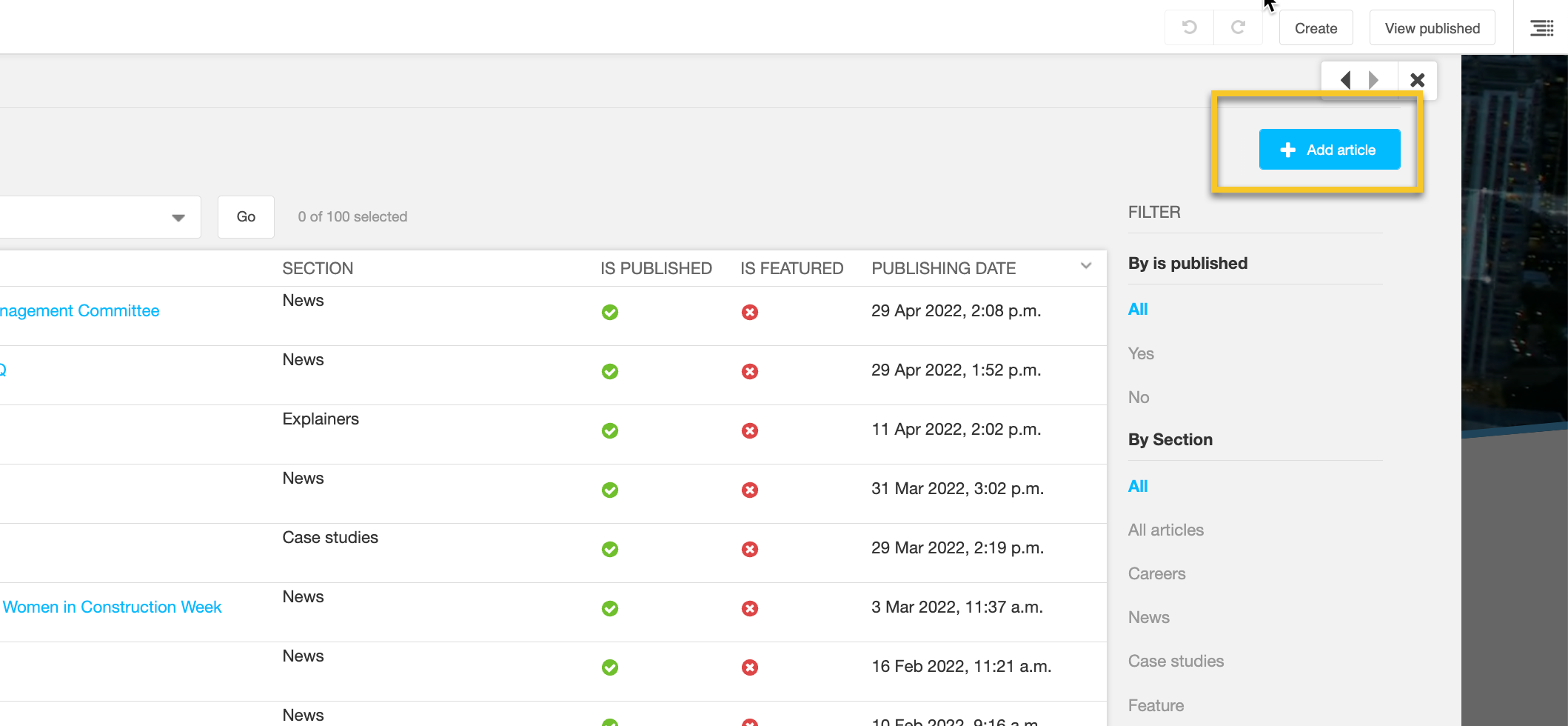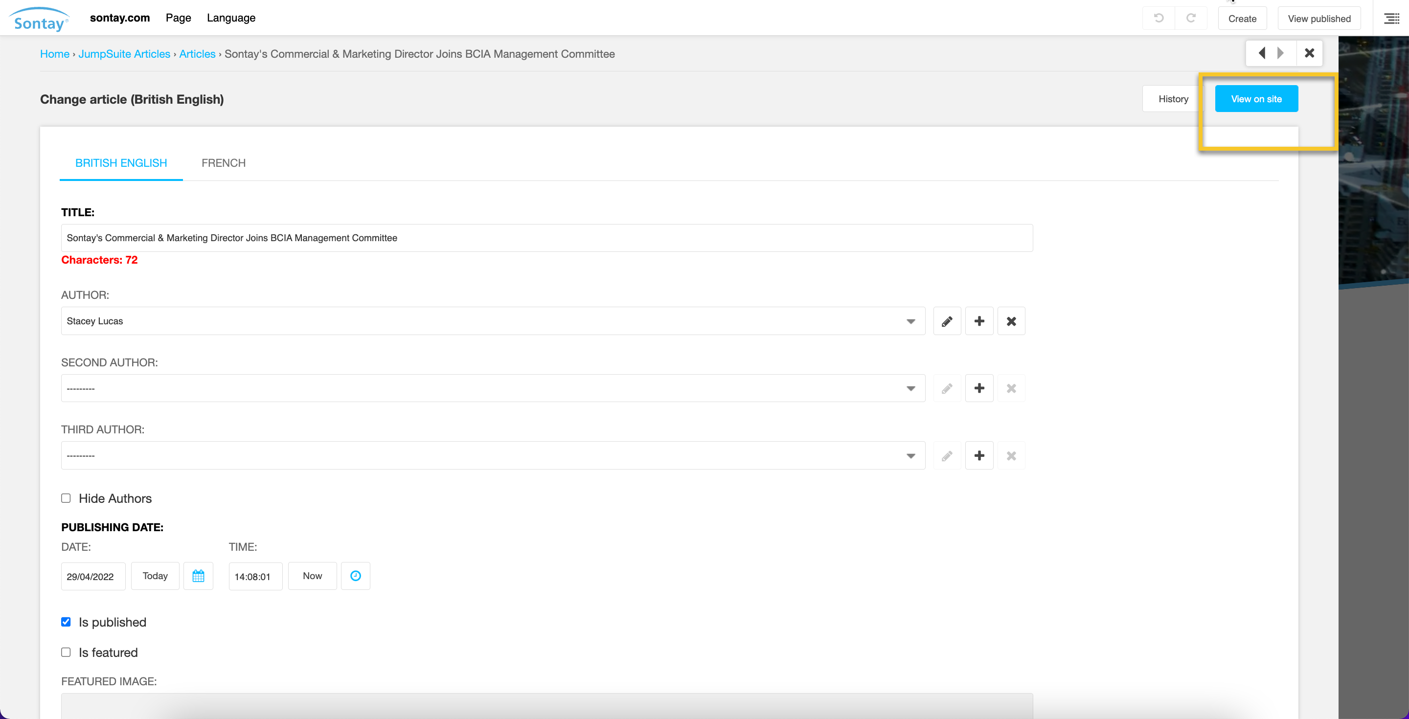 Step 8: After you save the article, click back into the article and press ‘view on site’